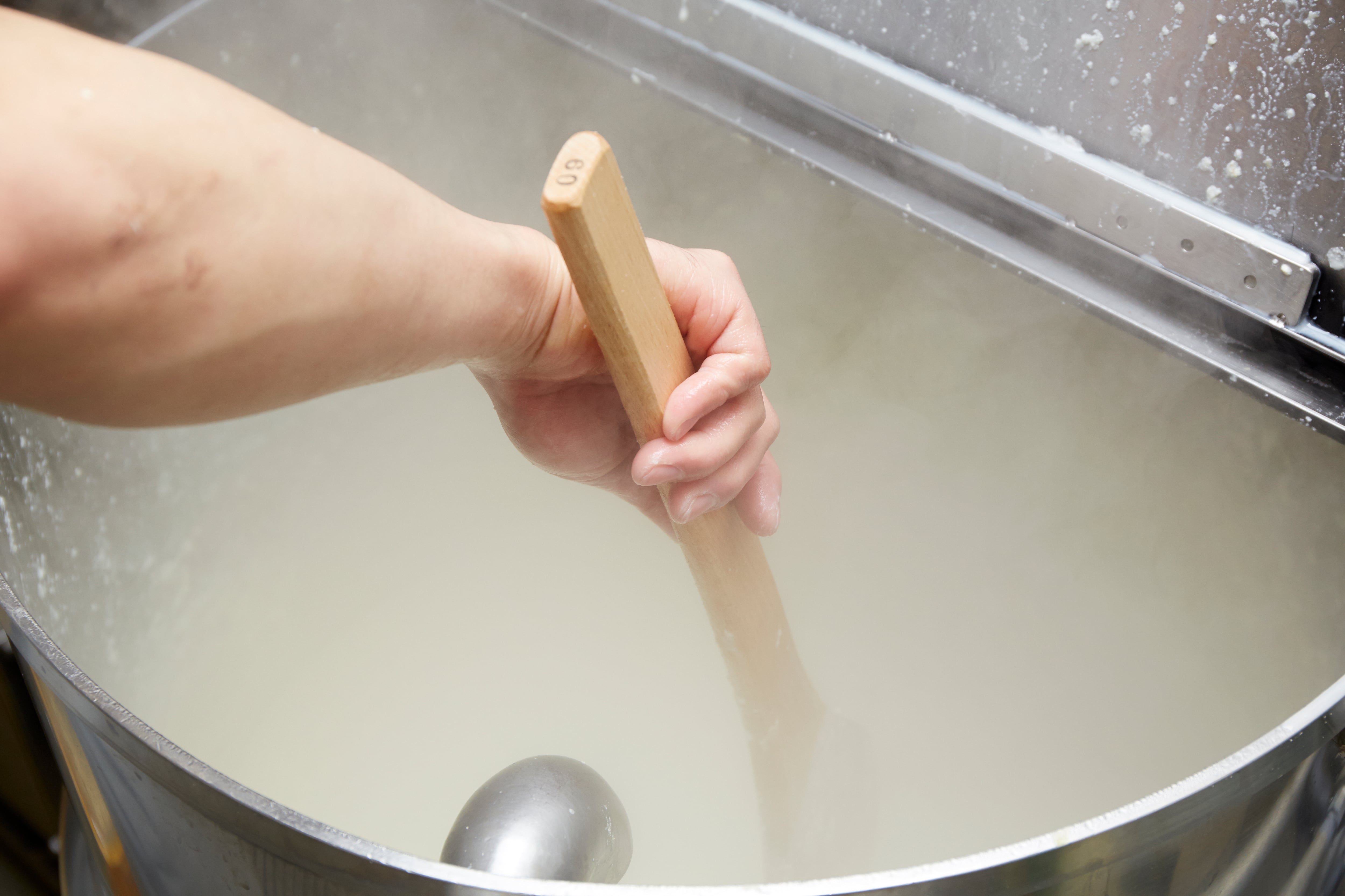 大豆をふやかし、すりつぶしてから煮て、海水にがりで固めるまで、
